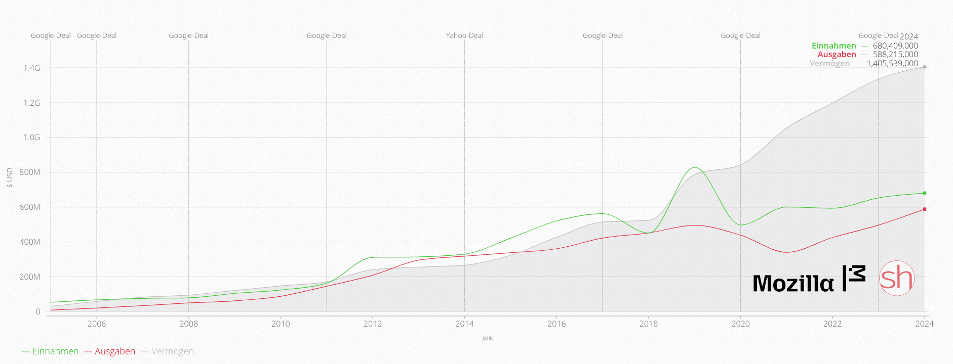 Wie gehabt gibt es auf soeren-hentzschel.at eine Spezial-Seite, welche die Einnahmen, die Ausgaben sowie das Vermögen von Mozilla seit dem Jahr 2005 bis heute visualisiert und die Entwicklung anschaulich gestaltet. Die Seite steht auch in englischer Sprache zur Verfügung.