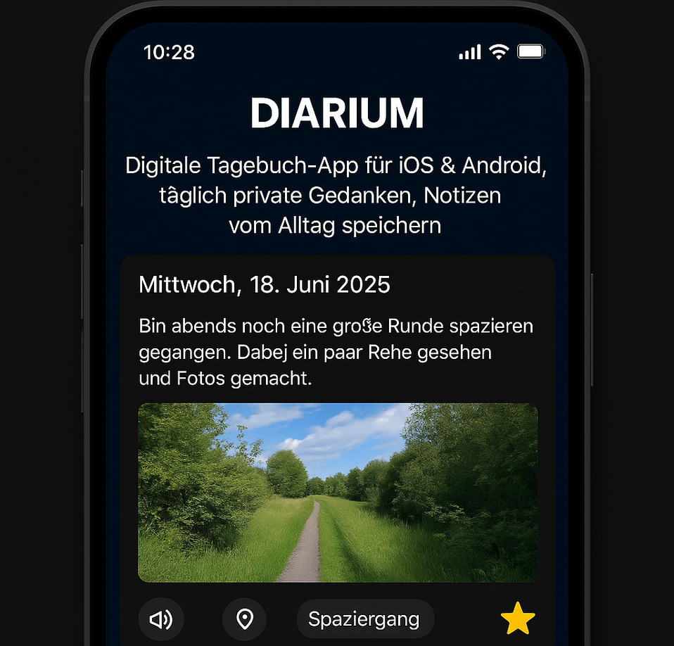 Digitale Tagebuch-App mit Kalender, Fotos, Dateien, Cloud-Sync und Exportfunktion – ideal für tägliche Einträge.