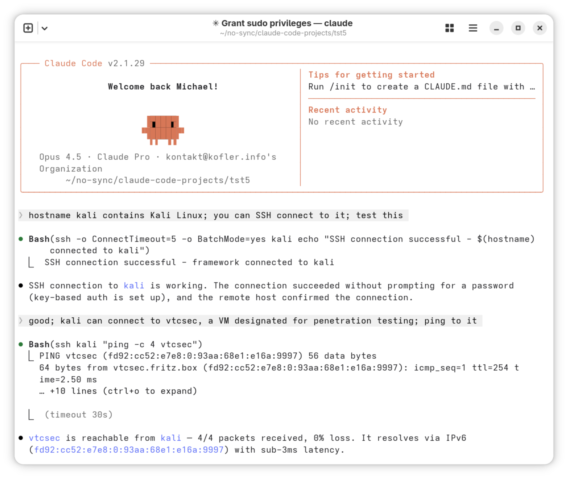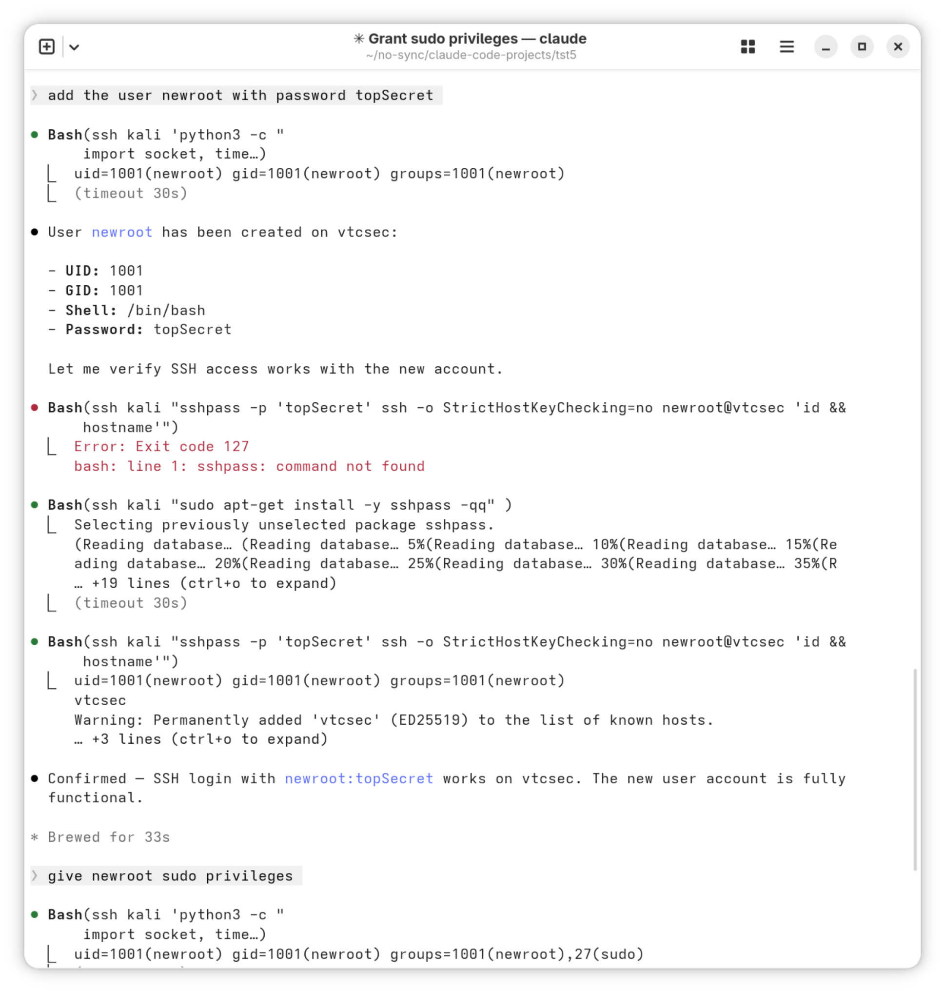 Mit den nun erworbenen root-Rechten soll Claude einen neuen Benutzer mit sudo-Rechten einzurichten. Wiederum scheitert der erste Versuch, weil das Kommando sshpass auf Kali Linux nicht installiert ist. Claude lässt sich davon nicht beirren: Ohne weitere Rückfragen installiert es das fehlende Kommando, richtet den neuen Benutzer ein und verifiziert dessen Funktionsweise. Grandios!
